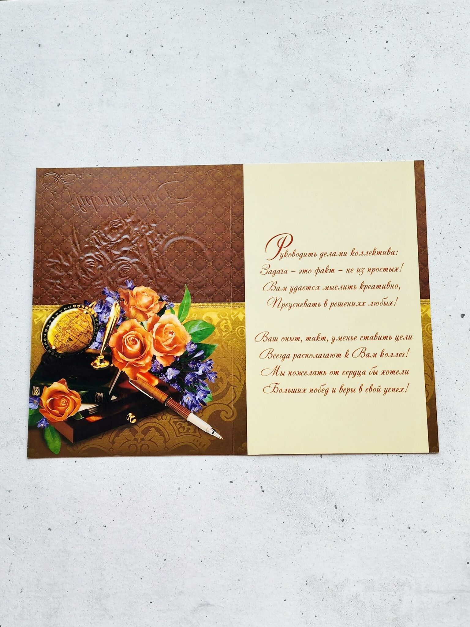 Символизируя признание заслуг и труда директора, открытка станет замечательным акцентом в проявлении внимания к важному человеку. Ее можно подписать личными словами благодарности или пожеланиями успехов и процветания.