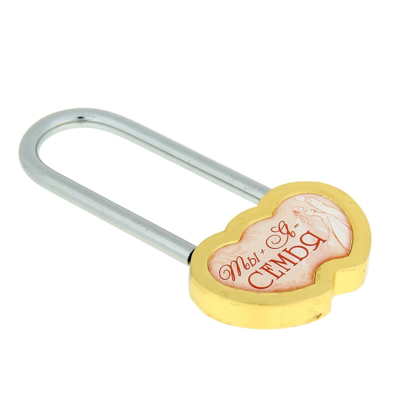Свадебный аксессуар преподносится на красочной подарочной подложке. Размер замка с дужкой: 4,7 х 0,9 х 9,5 см.